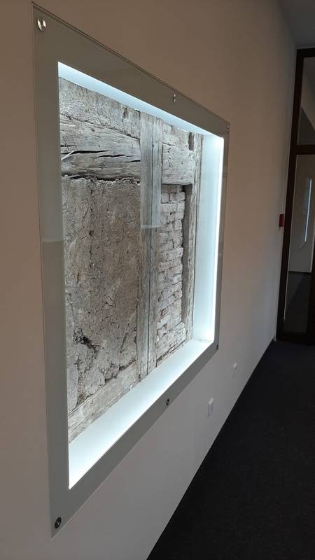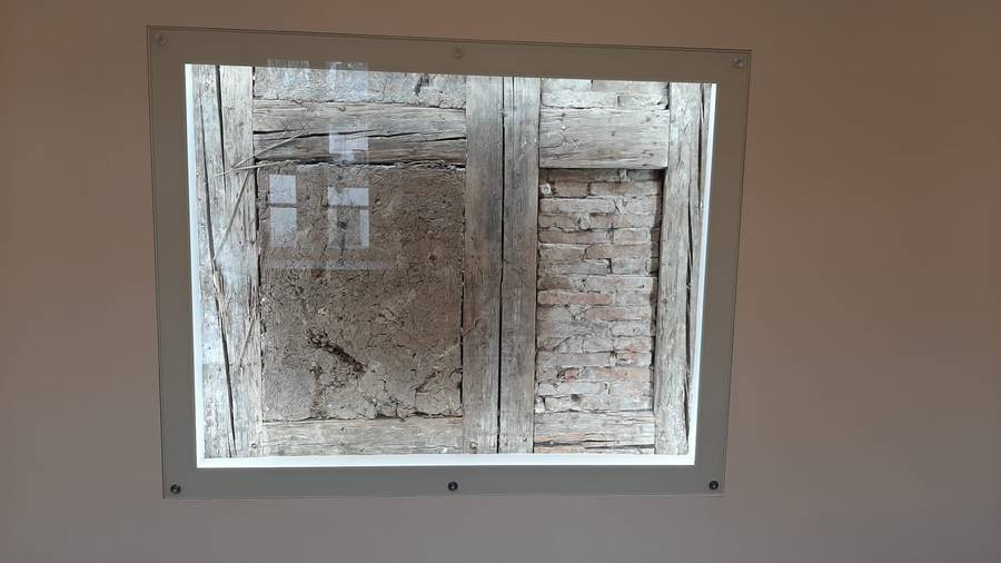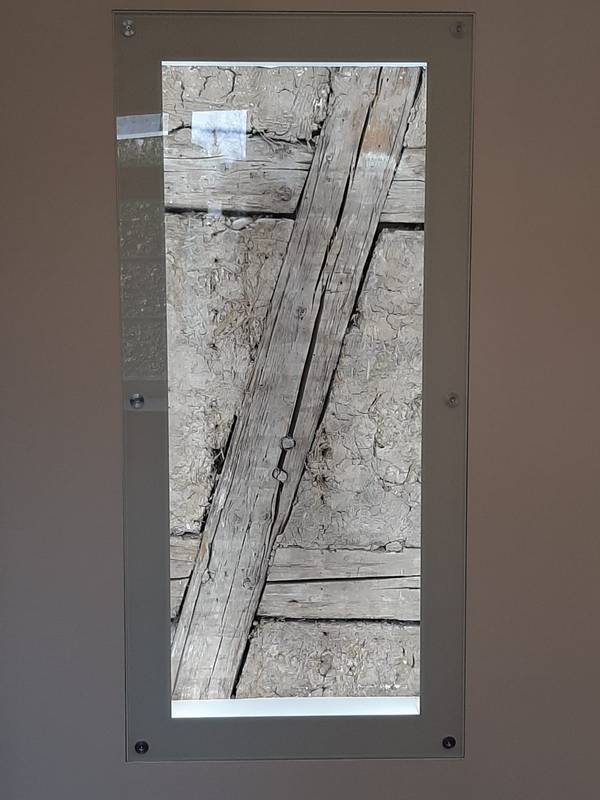 - Schutzverglasung – flächenbündig punktgehalten - für einen freien Blick auf die Fachwerkwand und deren Ausfachungen - mit umlaufender hochwertiger LED-Beleuchtung im Profilrahmen.
