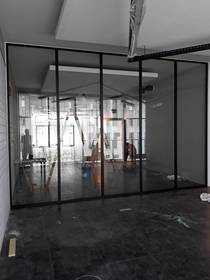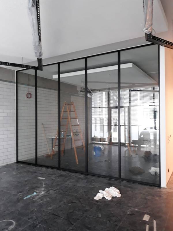 Bürotrennwand bestehend aus: Aluminium-Rahmensystem 507 x 334 cm in RAL 9005 Schwarz mit vertikalen Sprossenprofilen und Schallschutz-VSG