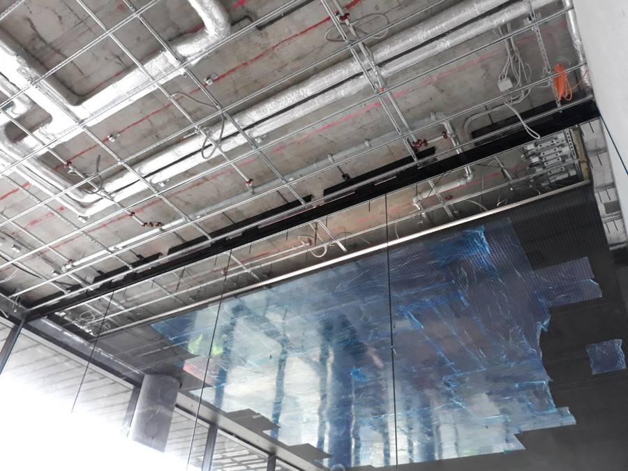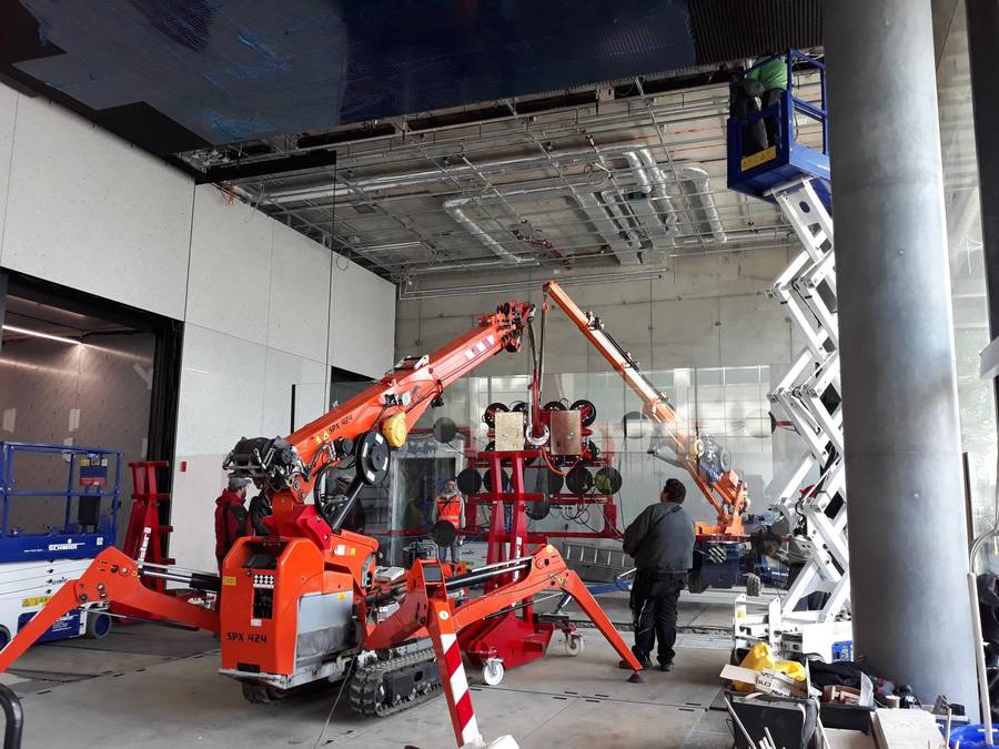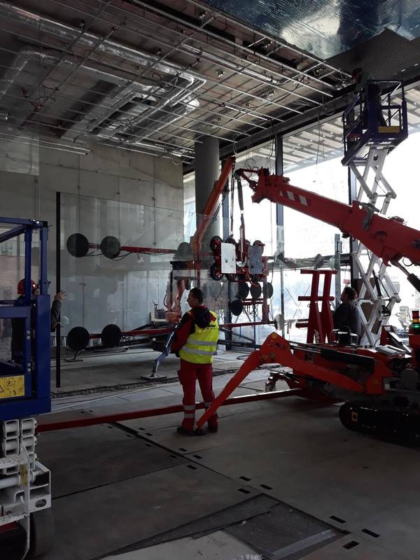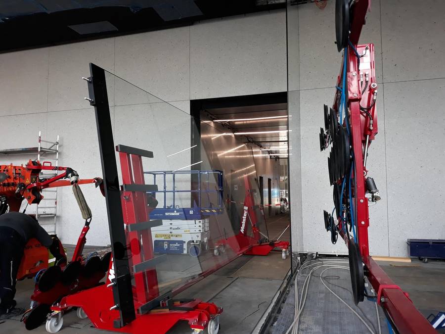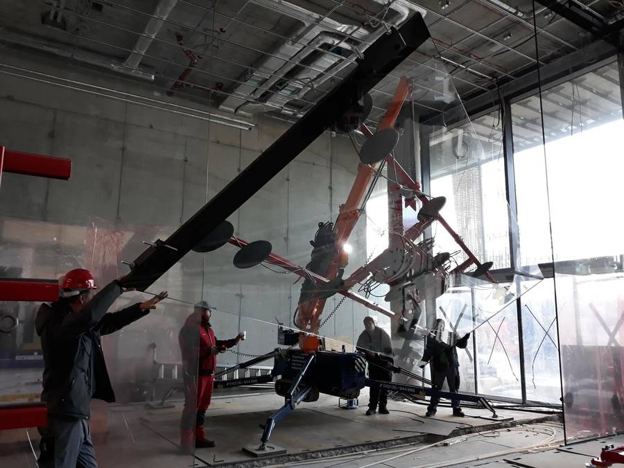 4 Glaselementen à 254 x 673 cm mit einem Gewicht von jeweils zirka 1.050 Kg, die in den Boden eingelassen wurden. Es handelt sich um VSG Weisglass, 2 x 12 mm TVG.