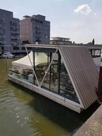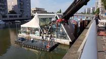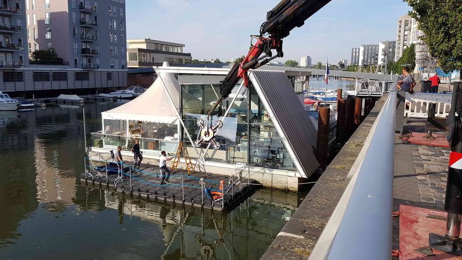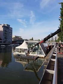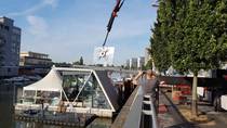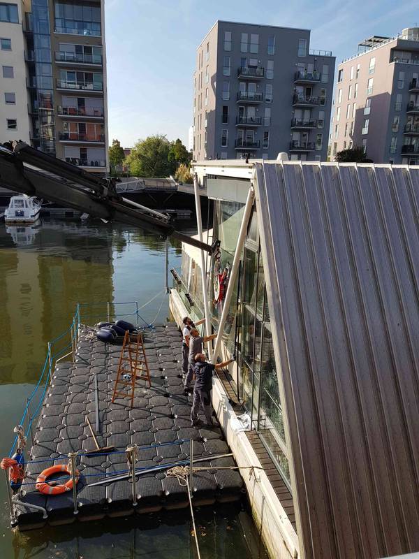 Die Verglasungseinheit wurde zwischen den V-förmigen Dachstreben der Marina hindurch, mit Kran und Saugbatterie, in die Öffnung gezaubert. Unsere Monteure haben die Arbeiten auf vom Wasser aus durchgeführt. Ein Ponton stand zur Verfügung.