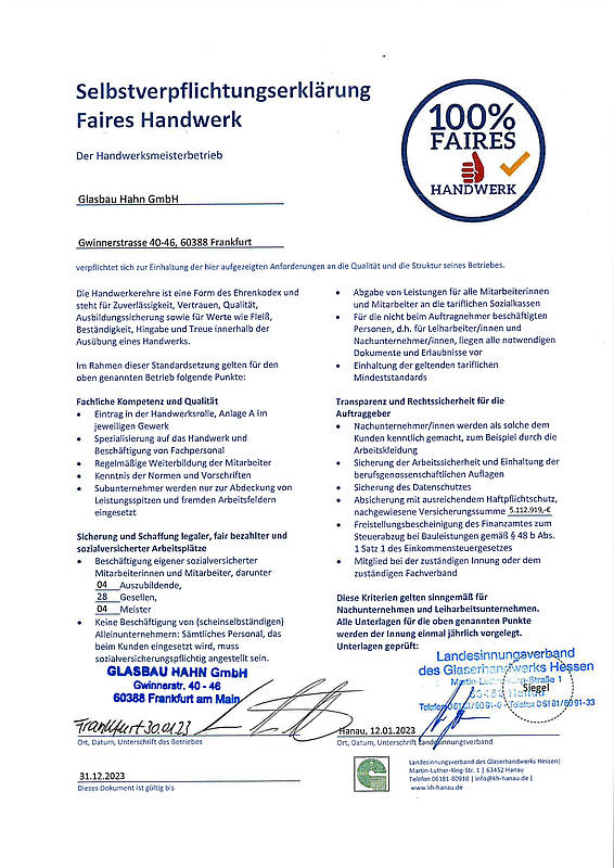 Auf dem Bau boomen unfaire und illegale Beschäftigungsmodelle. Skrupellose Anbieter umgehen geschickt die gesetzlichen Regelungen – auf Kosten der Arbeiter und der Allgemeinheit und mit erheblichen (Haftungs-)Risiken für die Auftraggeber. Der Landesinnungsverband des Glaserhandwerks Hessen hat sich daher der „Initiative Faires Handwerk“ angeschlossen, die von der Maler- und Lackiererinnung Rhein-Main ins Leben gerufen wurde. Mit ihr setzt sie sich für sozialverträgliche und faire Arbeitsbedingungen ein.
