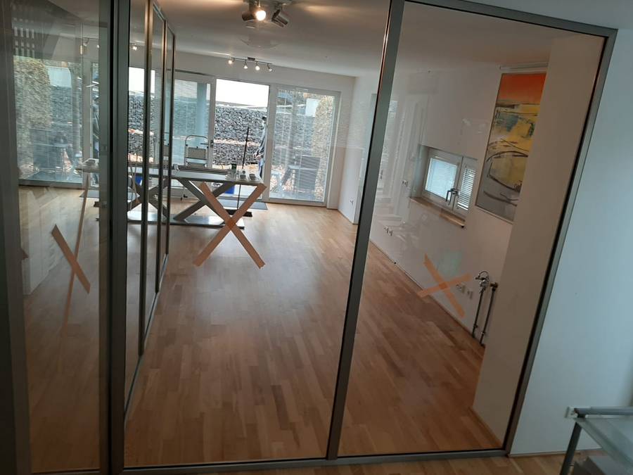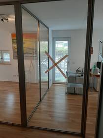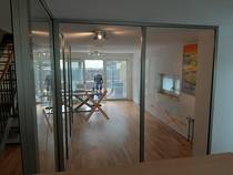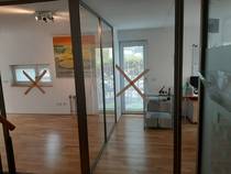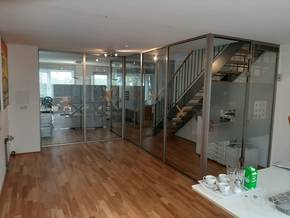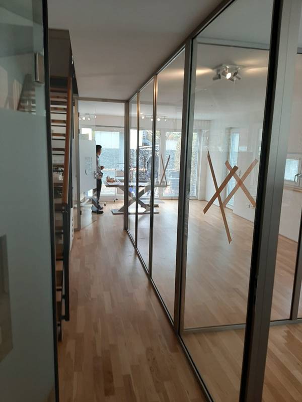 Wir haben zunächst eine vorhandene Trennwand teilweise demontiert. Anschließend montierten wir eine neue Glastrennwand mit Alurahmen, die an die vorhandenen Türen angeschlossen wurde.