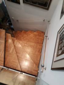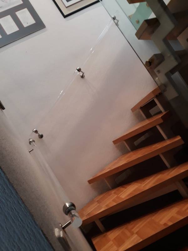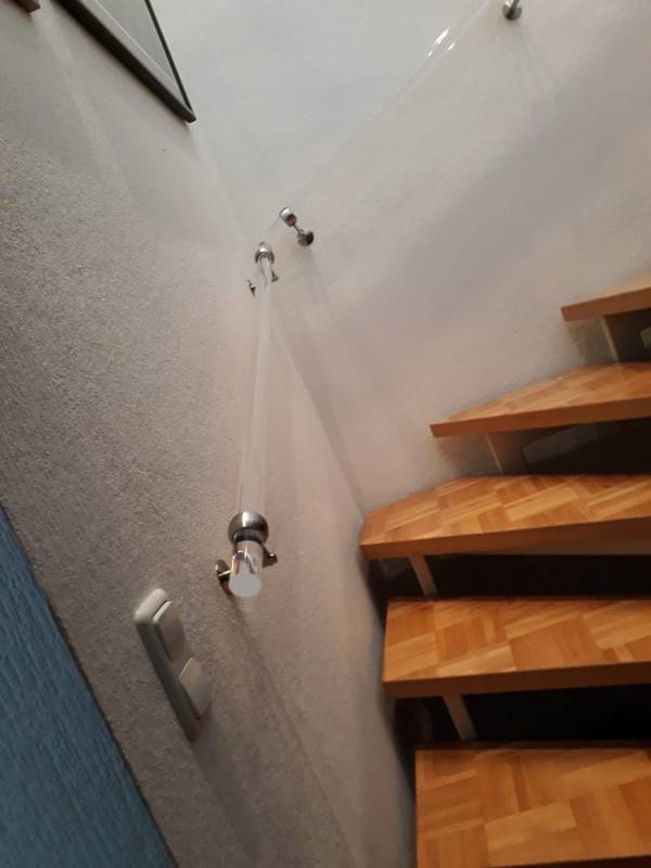 Die Fotos zeigen einen schönen 2-teiligen Handlauf, gefertigt aus einem Acrylglasstab und mit Edelstahlhaltern befestigt.