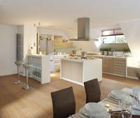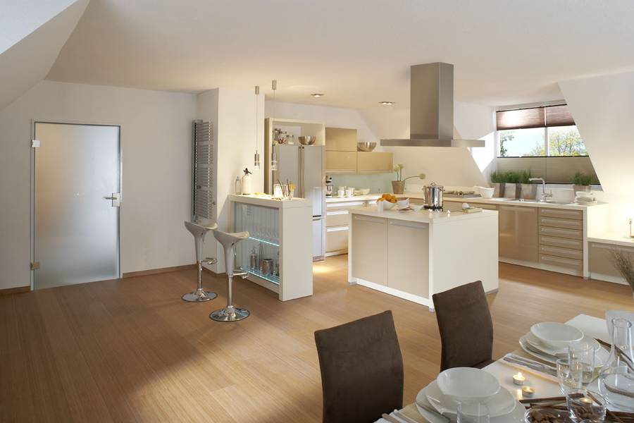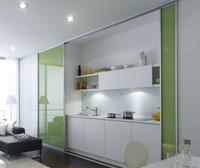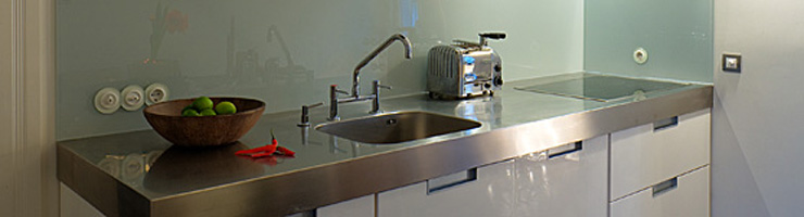 Glasarbeitsplatten und -rückwände für elegante Küchengestaltung und hygienische und komfortable Reinigung, integrierte Warmhaltebereiche, Glastüren und Glasfronten.