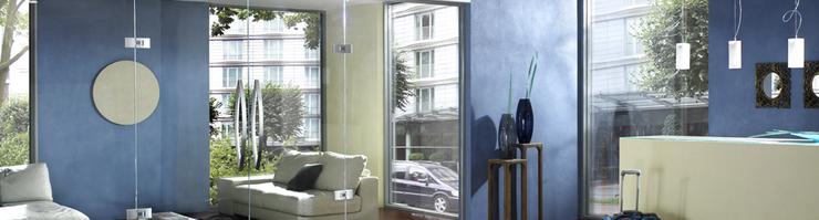 Ganzglasanlagen für Eingangsbereiche oder zur großzügigen Trennung einzelner Wohnbereiche, Wände aus Glas, Spiegel, Schiebetüren und Drehtüren, Glastreppen und -brüstungen, begehbare Schränke mit Glasschiebetüren, Glasdecken mit Beleuchtung, Glasmöbel und Glastischplatten.