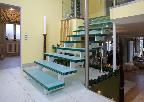 Unzählige Gestaltungsmöglichkeiten machen Stufen aus Glas noch reizvoller: Farbe, Beleuchtung, Form, Struktur und Schliff können individuell nach Ihren Wünschen eingesetzt werden.