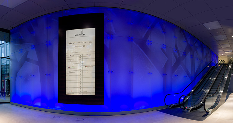 Unsere Wandverkleidungen sind modular aufgebaut und daher flexibel einsetzbar. Neben hochfestem, ab 10 mm starkem ESG oder VSG kommt das zweiteilige System aus tragender Konstruktion und GLASBAU HAHN 2-Wege Drehbeschlag zum Einsatz. Die Öffnung erfolgt dabei mechanisch oder per automatischer Entriegelung. Der Gestaltung unserer Wandverkleidungen sind praktisch keine Grenzen gesetzt: Sie können digital bedruckt oder in einer beliebigen RAL-Farbe lackiert werden. Rückseitig beleuchtet verwandeln sie Räume in imposante Stimmungswelten.