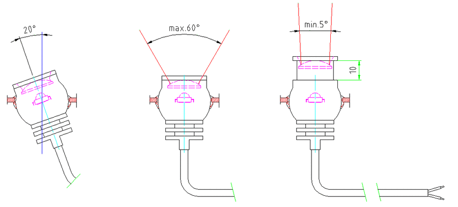 - BEWEGLICHER TEIL – enthält die Linse und kann mit Hilfe eines Gewindes durch Drehung das Lichtbündel fokussieren. Er kann bis auf 10 mm aufgedreht werden und ermöglicht einen Abstrahlwinkel zwischen 5° und 60°.