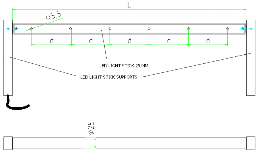 Der LED LIGHT STICK Ø25 mm ist ein Aluminium Profil mit innen befestigter LED-Lichtleiste. Der Light Stick besteht aus dem Aluminium-Profil, zwei Auflageleisten, verkabelt mit High Flux LEDs (Typ Z-Power P4), seitlichen Befestigungsteilen und einem Verbindungskabel.