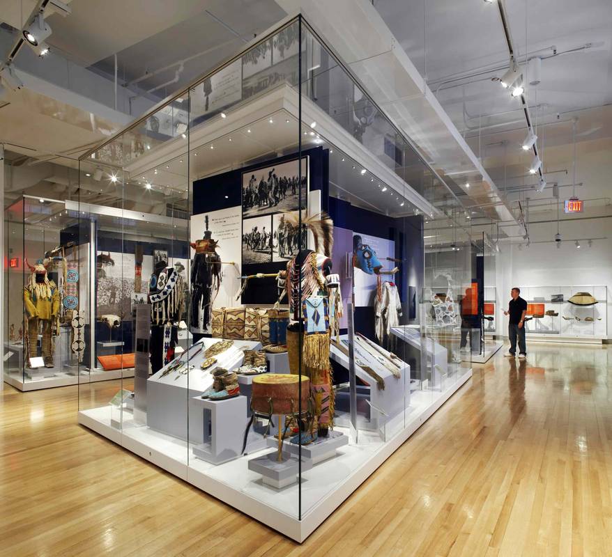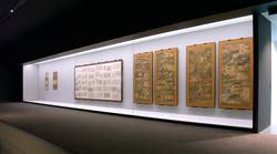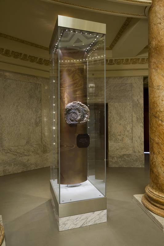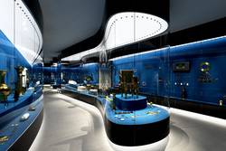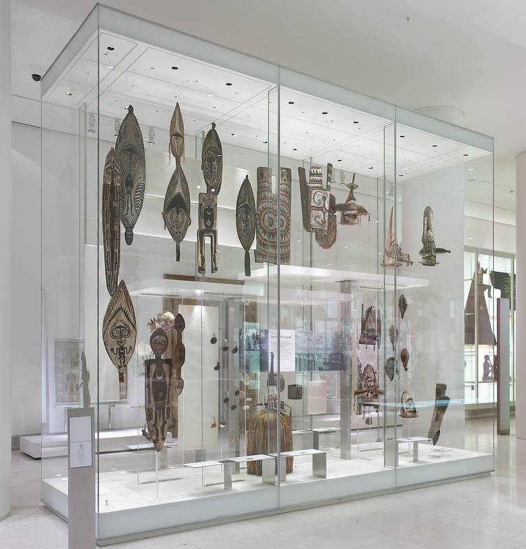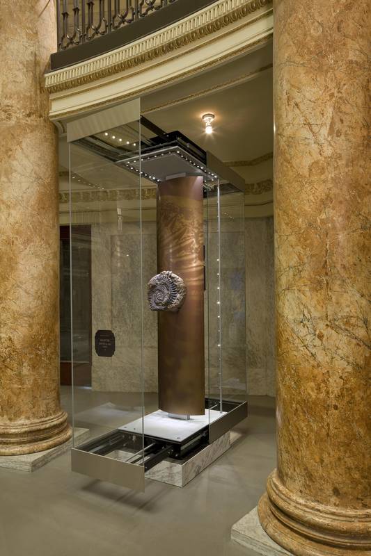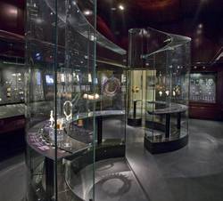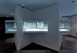 Extra große Freistehende Vitrinen mit 6 m Länge , 2 m Tiefe und 5 m Höhe mit Lichtfaser-Beleuchtung sowie eine Wandvitrine mit 15 m Länge. Alle Vitrinen der Galerie sind mit dem HAHN RK-2-Xa Klimatisierungssystem verbunden, das für ein stabiles Mikroklima in den Großvitrinen sorgt. Die Klimadaten werden vom PC mit der HAHN CON-TROL Software überwacht, die, für Besucher unsichtbar, in einem getrennten Raum untergebracht ist.