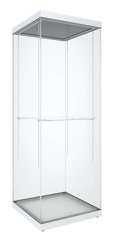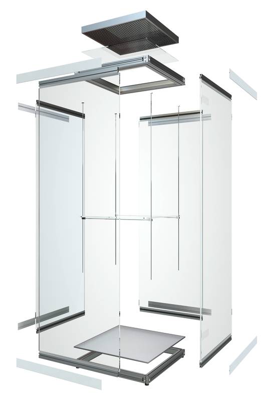 Die obere und untere Rahmenkonstruktion aus Aluminium-Präzisionsprofilen lässt sich schnell und einfach zu einem Ganzglas-Korpus verbinden. Die Deckleisten zur Abdeckung der Rahmenprofile sind nach RAL Farben Pulver beschichtet. Verstellbare Schraubfüße im Rahmen gleichen Bodenunebenheiten aus.