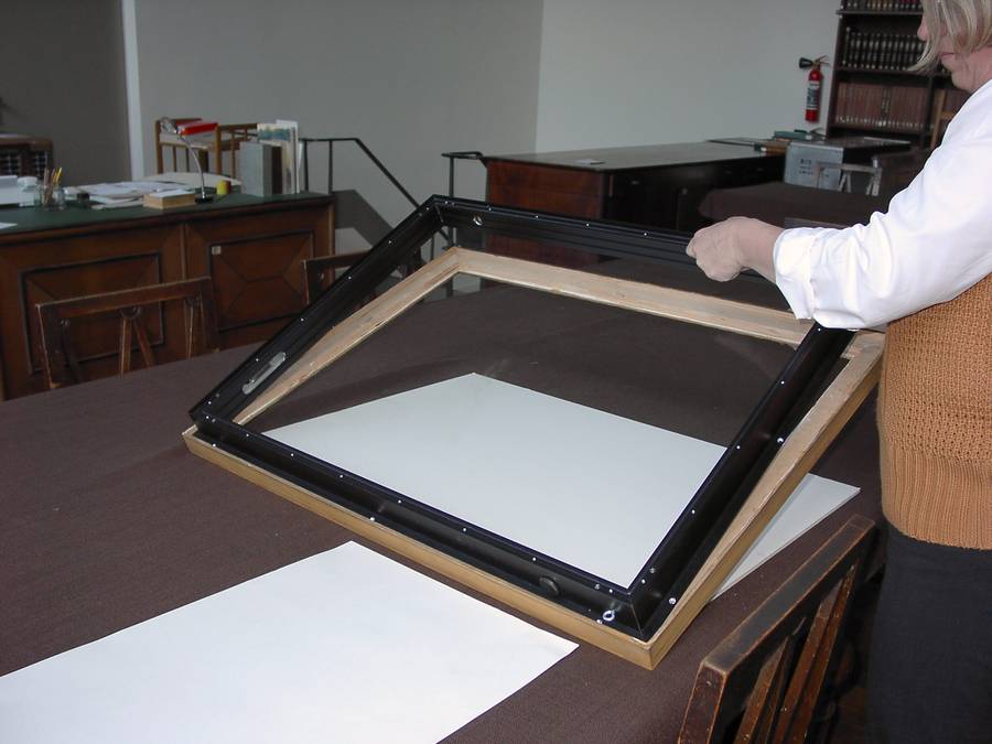 Die Vitrine ist vorgerüstet mit Filzleisten, die den gewünschten Abstand zwischen Gemälde und Glas gewährleisten.